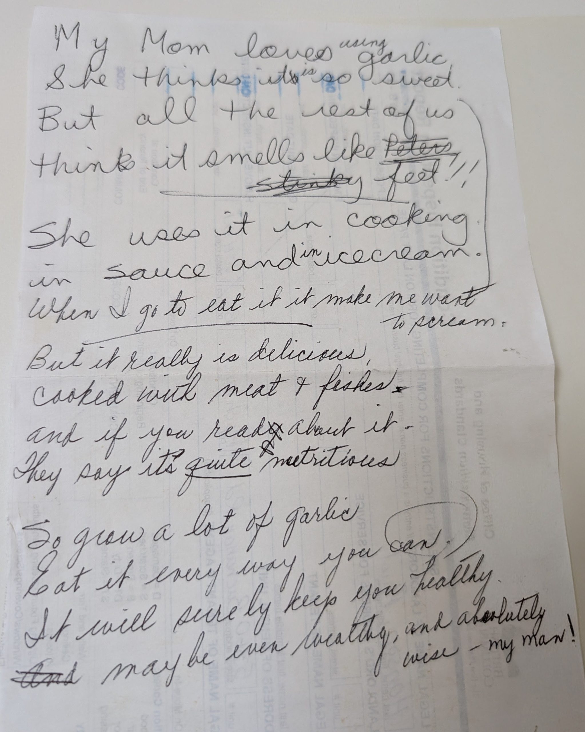 Mom was always a healthy eater and can be credited for Dad’s long life. In addition to the garlic, we children ate comfrey and dandelions in our salad and drank tigers milk (a blended concoction of milk, molasses, and brewers yeast). Her favorite colour was red, she NEVER turned down ice cream and loved her flowers, especially her roses and lilies.